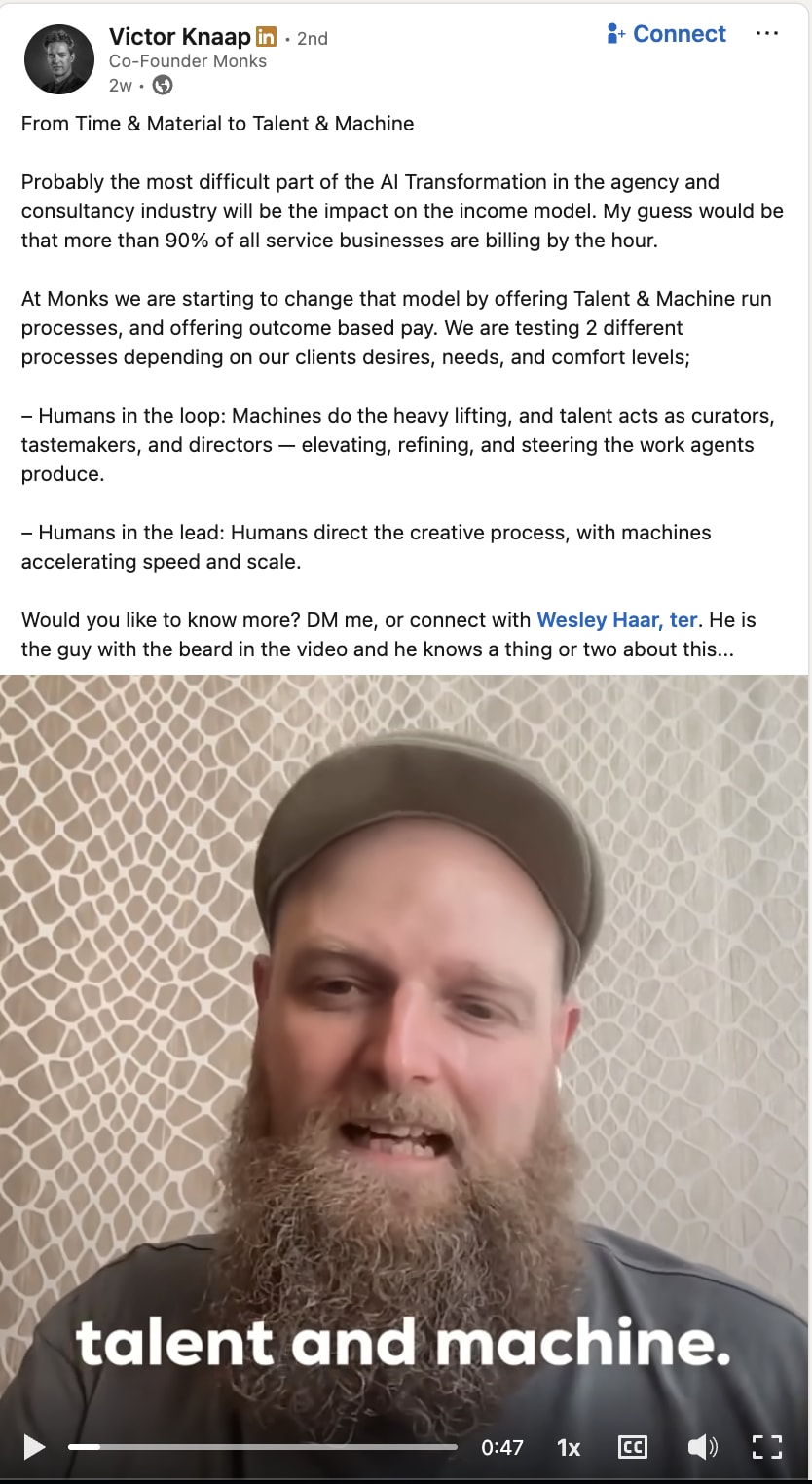 Well, actually, there is. This chap (Wesley Haar, ter), an occasional visitor to our fine neighborhood here, seems to be onto something. This is be a best case giant step forward to what I’ve had great experiences with - FIXED FEE engagements. Can’t wait to see it in action. These guys seem pretty comfortable leading from the front.