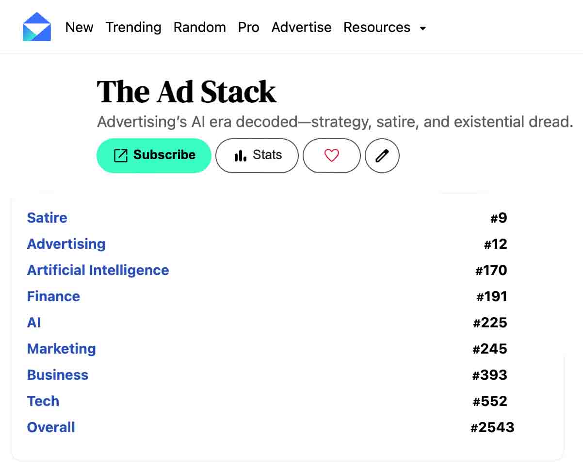 Pleased as punch you made The Ad Stack #9 in satire and #12 in Advertising.