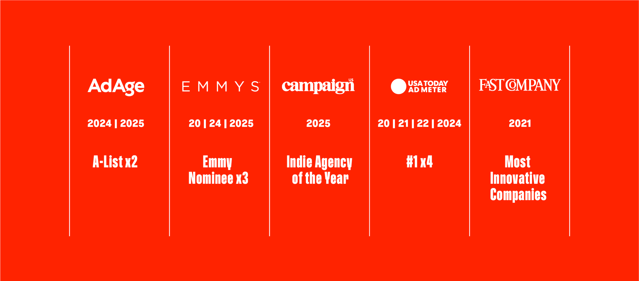 They came back in 2024 with another #1 for State Farm featuring Schwarzenegger and DeVito NBC ChicagoCampaign Live, plus a BetMGM spot with Tom Brady and Vince Vaughn. Most recently, their Lay’s commercial with Taika Waititi hit #2 in 2025 Indie Agency News. That’s four #1 rankings and consistently top-10 finishes, a ridiculous streak that makes them the agency whose work everyone’s watching on game day.