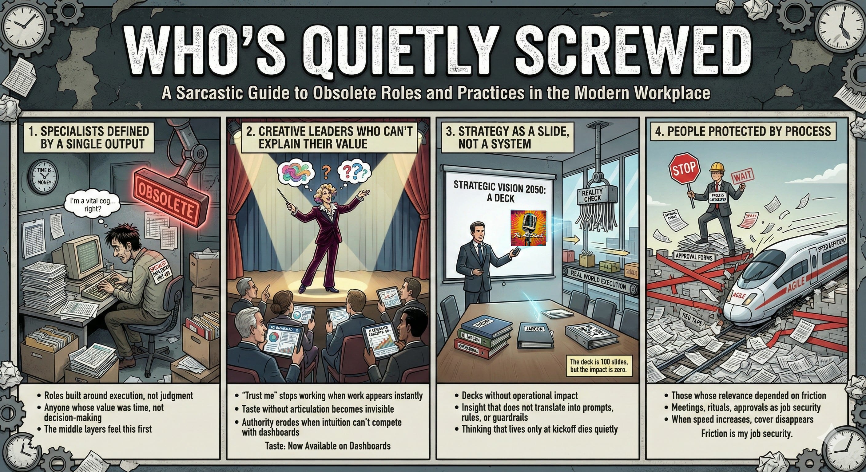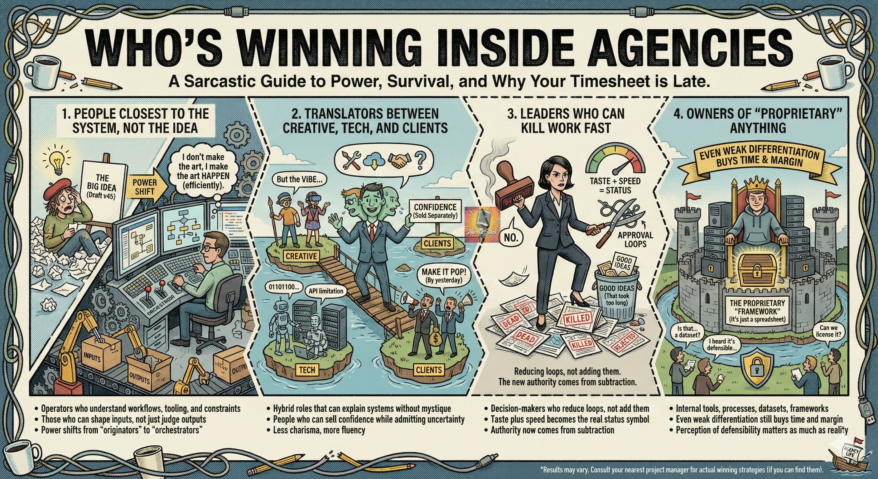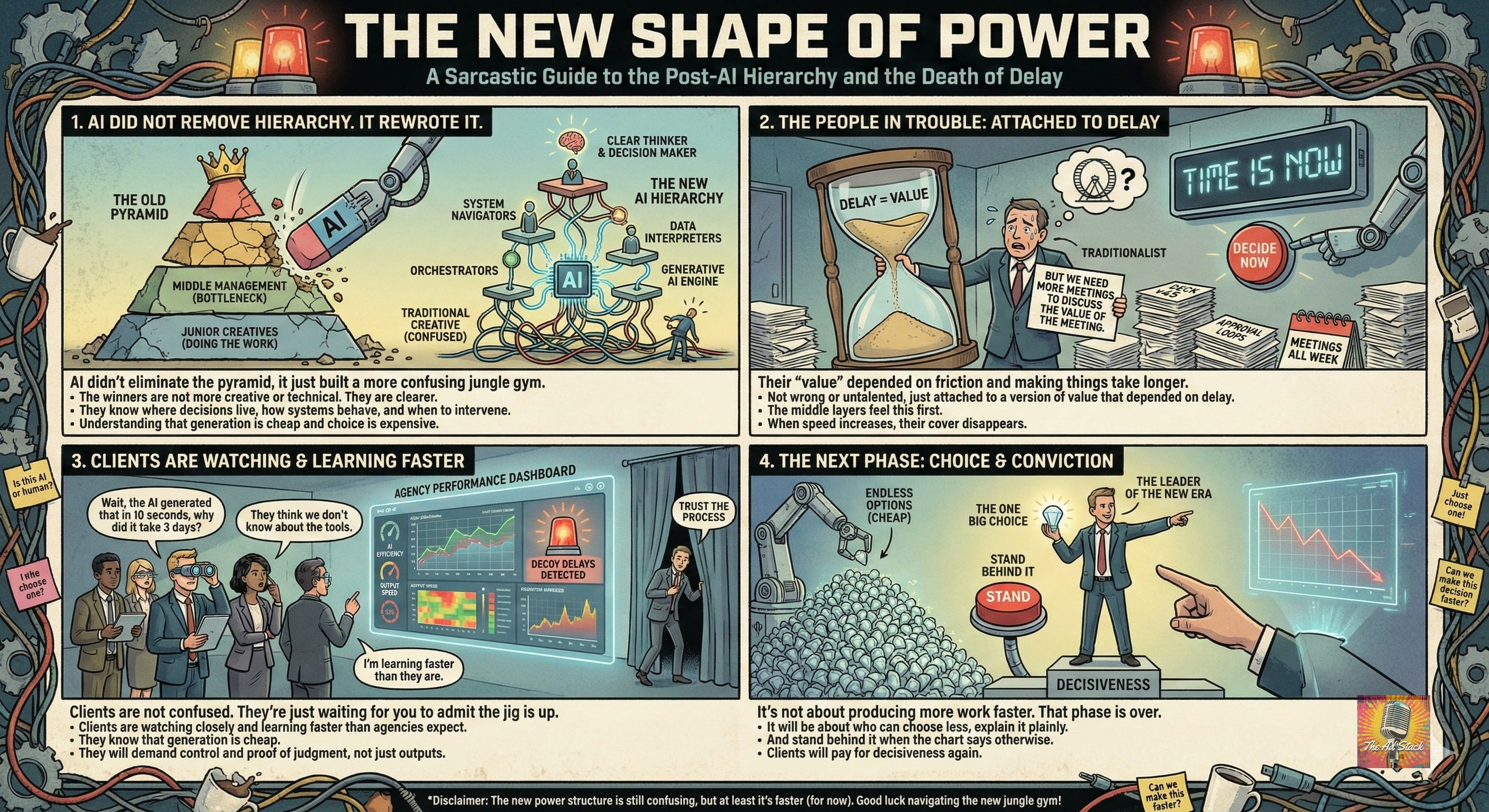 Meetings. Rituals. Review cycles. Layers of approval. Four account people because that’s how we’ve always done it. For a long time, friction created safety. It absorbed accountability and justified headcount. When speed increases, that cover disappears. The work shows up faster, and so does the question of who actually decided anything.
