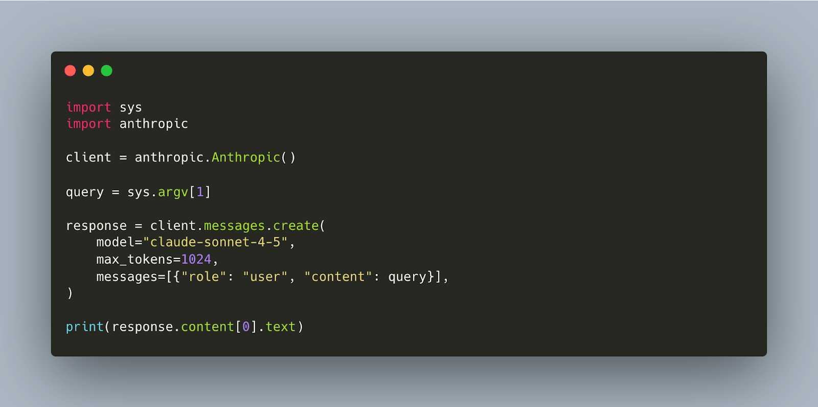 This script calls the Claude API with a user query passed via command line. It sends the query, gets a response, and prints it.